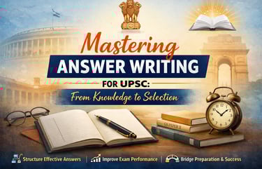 This blog explores the crucial role of answer writing in cracking the UPSC and State PCS examinations, emphasizing that knowledge alone is not sufficient - effective expression is the key to success. It highlights the gap between preparation and performance and presents a structured, stage-wise approach to mastering answer writing. The discussion covers understanding questions, structuring answers, adding value, and improving presentation under time constraints. It also underscores the importance of practice, feedback, and consistency. Overall, the blog guides aspirants on transforming their preparation into performance, ultimately helping them move from knowledge accumulation to achieving selection in the examination.