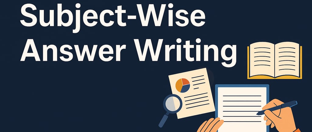 Subject-wise answer writing is a crucial skill for excelling in exams that are descriptive in nature, such as UPSC/ PCS Mains or university exams. While a general structure applies to most subjects (Introduction, Body, Conclusion), the content, depth, and specific techniques vary.